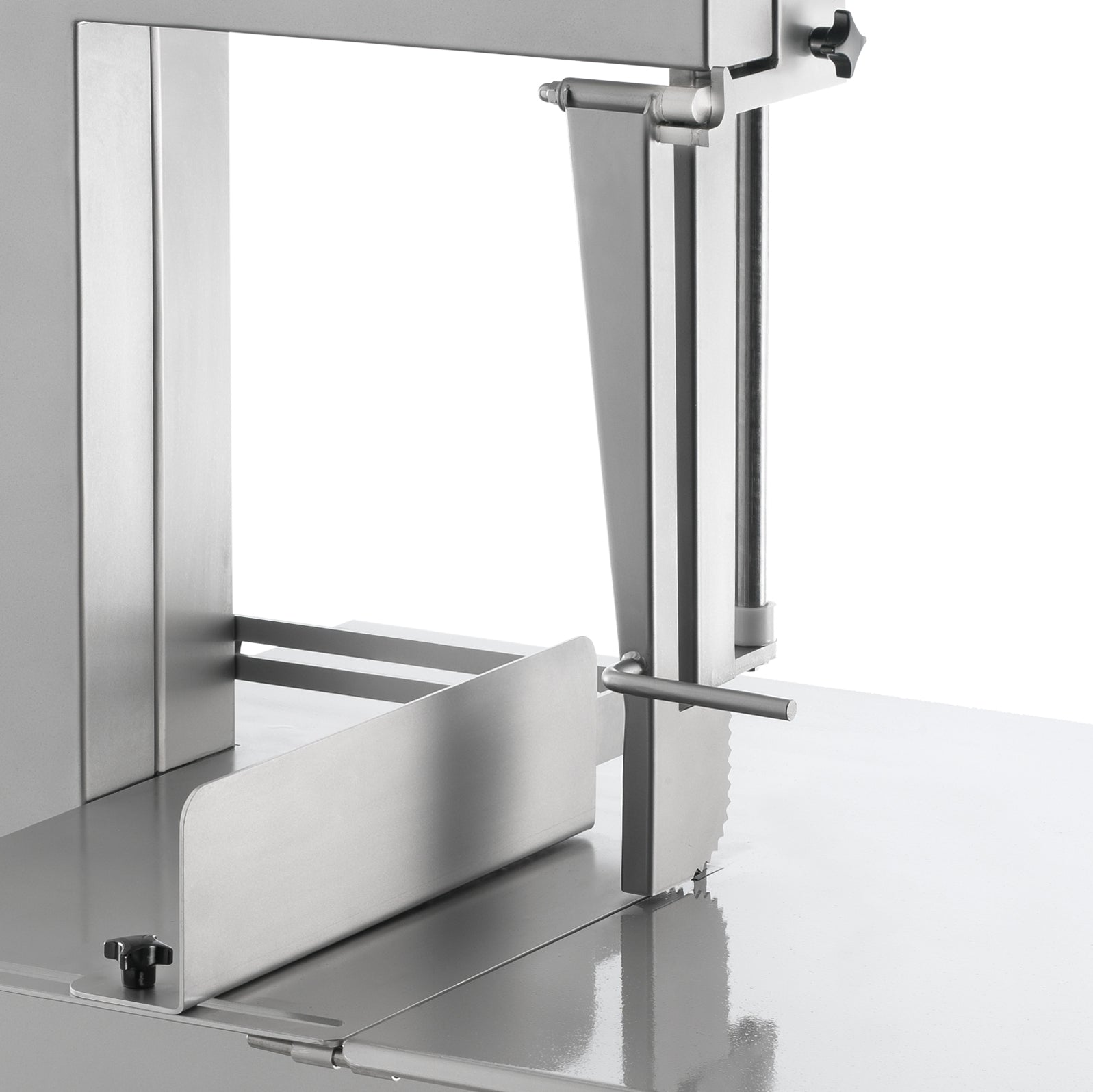 The 24V control system with microswitches on the doors and waste container enhances safety, making it an ideal choice for cutting a variety of food products. With its automatic band tensioner and thickness adjustment stopper, this machine delivers precise cuts consistently.