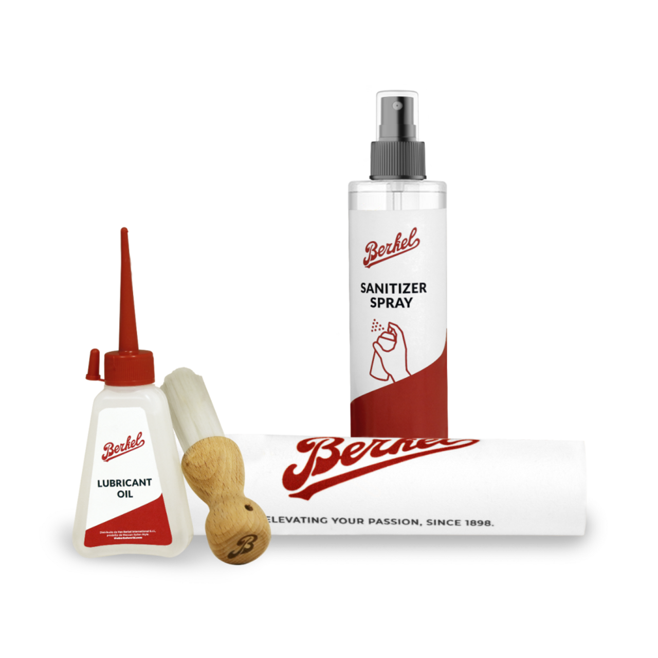 The kit includes an ultra microfibre cloth, sanitising spray, oil bottle, and a delicate cleaning brush, all housed in an eco-sustainable Crush Cherry paper box. This kit supports your slicer's maintenance and embodies a sustainable approach to cleanliness, making it an essential addition to your Berkel slicers.