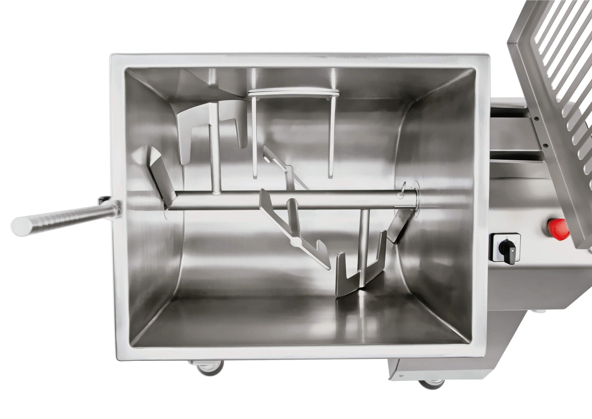 Its gear-driven motor provides both forward and reverse motions, ensuring that all ingredients are thoroughly mixed for a homogenous result, whether it's sausage meat, coleslaw, or sandwich fillings. Designed for convenience, the RC100 features observation slots for real-time process monitoring, a tilting bowl for effortless emptying, and removable paddles for easy cleaning.
